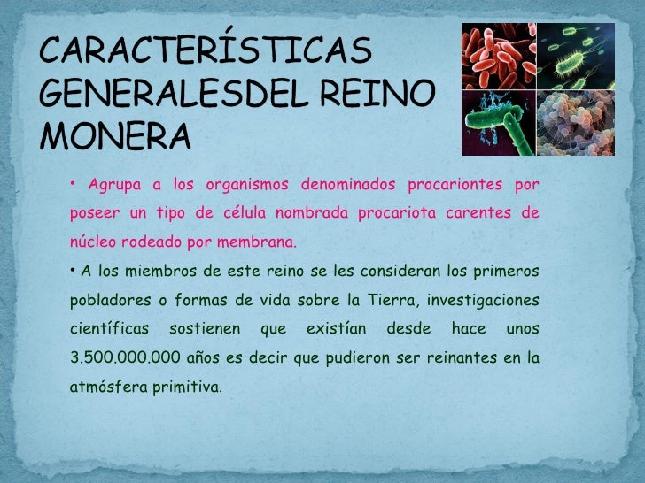Que es el reino monera esta integrado por los organismos procariotas unicelulares. los organismos procariotas son celulas que carecen de envoltura nuclear, cloroplastos y otros plastidos, mitocondrias y flagelos. son unicelulares pero aveces se presentan como filamentos u otros cuerpos superficialmente multicelulares. mónera es un reino de la clasificación de los seres vivos para algunos sistemas, como el de Lynn Margulis, que agrupa a los organismos procariotas, siendo aún usada en muchos manuales y libros de texto. El término actual equivalente es procariota y se define como el reino de organismos microscópicos que habitan todos los ambientes y que están formados por una sola célula sin núcleo definido (célula procariota)